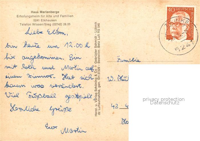 73120754 alte Postkarte Elkhausen Sieg Fliegeraufnahme Haus Marienberge postalisch gelaufen Erhaltung siehe scans [LiesaD40] KatCode: 11110007132080