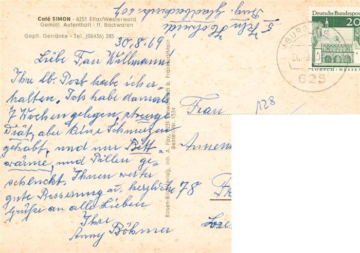73887578 alte Postkarte Ellar Limburg Lahn Cafe Simon Gastraeume Kirche postalisch gelaufen Erhaltung siehe scans [FriedD77] KatCode: 11110006533016