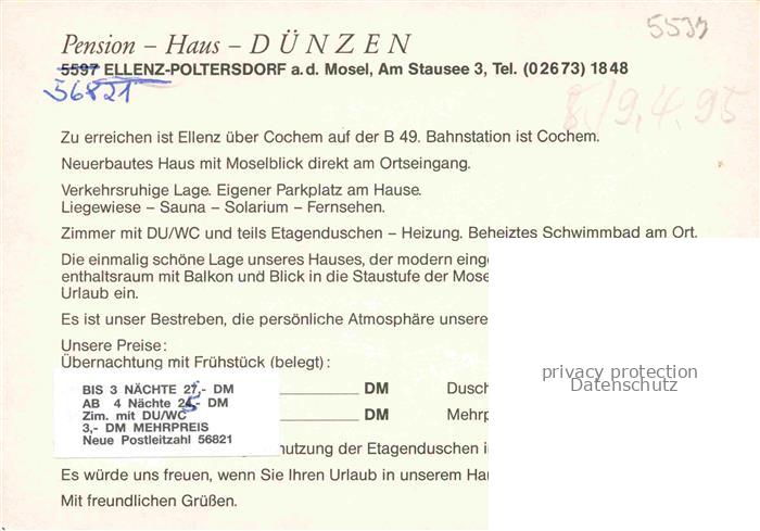 74055013 Ellenz-Poltersdorf Mosel Panorama PensionHaus Duenzen Gastraum postalisch nicht gelaufen Werbekarte (keine Postkarte) Erhaltung siehe scans [WerneD78] KatCode: 11110007135025