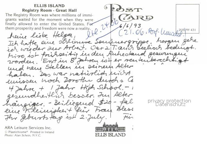 72865320 Ellis Island New York Registry Room Great Hall American Flag postalisch nicht gelaufen Erhaltung siehe scans [FriedD77] KatCode: 14140