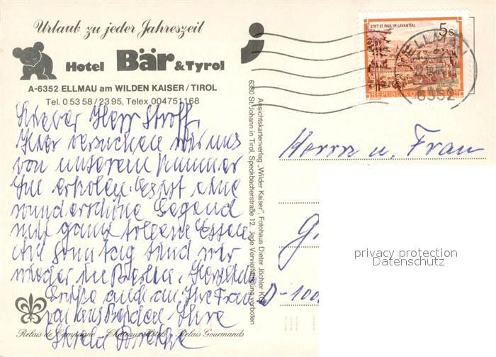73641481 alte Postkarte Ellmau Tirol Hotel Restaurant Baer Blumenwiese Kapelle postalisch gelaufen Erhaltung siehe scans [FriedD77] KatCode: 11390335070509