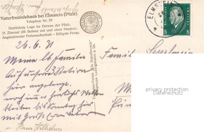 73803513 alte Postkarte Elmstein Ludwigshafener Naturfreundehaus und Ferienheim postalisch gelaufen Erhaltung siehe scans [FriedD77] KatCode: 11110007332014