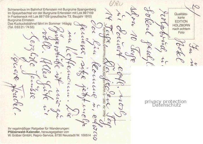 74046765 Elmstein Rheinland-Pfalz Schienenbus Burgruine Erfenstein Kuckucksbaehnel ins Elmsteiner Tal postalisch nicht gelaufen Erhaltung siehe scans [WerneD78] KatCode: 11110007332014