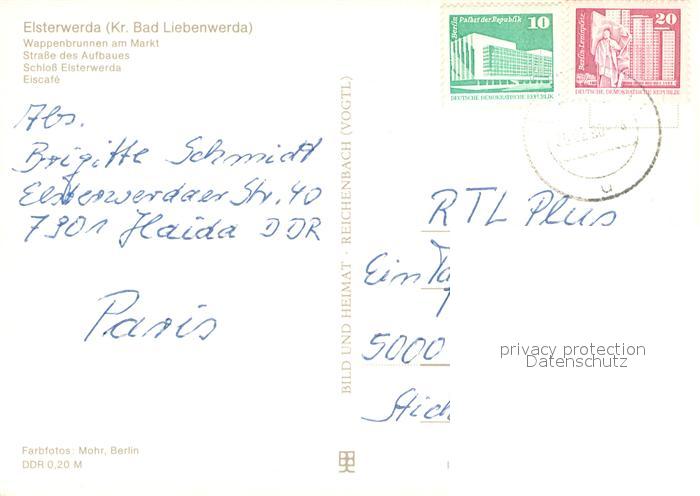 73656117 alte Postkarte Elsterwerda Wappenbrunnen am Markt Strasse des Aufbaues Schloss EisCafe postalisch gelaufen Erhaltung siehe scans [FriedD77] KatCode: 11110012062124