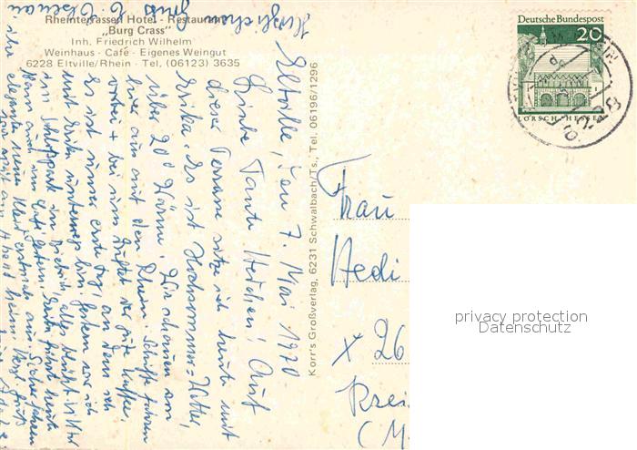 72891803 alte Postkarte Eltville Rhein Rheinterrassen Hotel Restaurant Burg Crass postalisch gelaufen Erhaltung siehe scans [LiesaD40] KatCode: 11110006439003