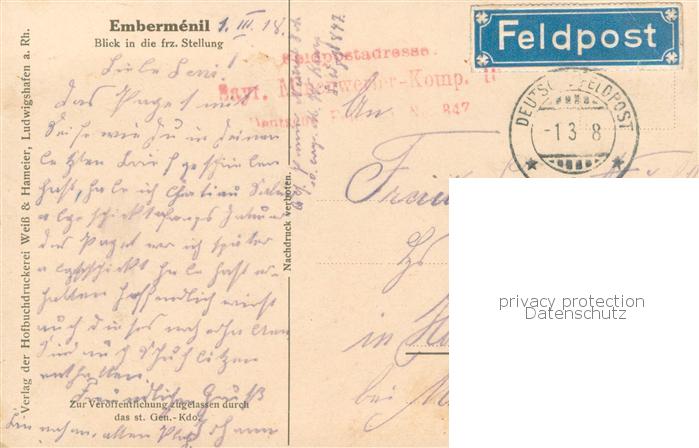 13772196 Embermenil 54 Meurthe-et-Moselle Blick in die frz Stellung postalisch gelaufen Feldpost – Stempel Erhaltung siehe scans [FriedD77] Feldpost – Stempel carte postale Frie Katcode 11170054254177