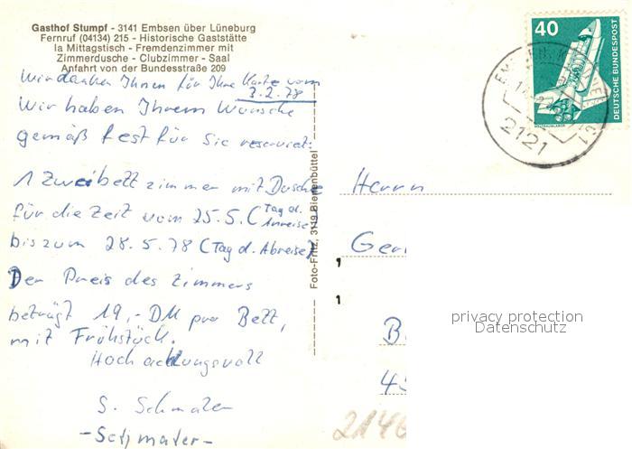 73115239 alte Postkarte Embsen Lueneburg Gasthof Stumpf postalisch gelaufen Erhaltung siehe scans [NatalD47] KatCode: 11110003355016