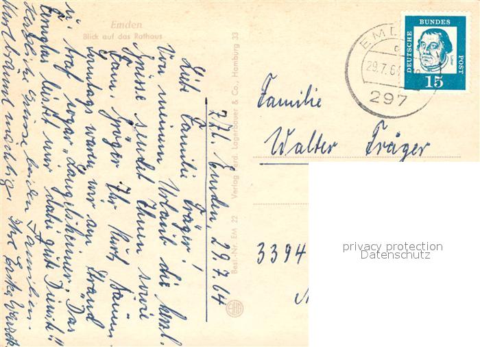 73608907 alte Postkarte Emden Ostfriesland Blick zum Rathaus postalisch gelaufen Erhaltung siehe scans [WerneD78] KatCode: 11110003402000