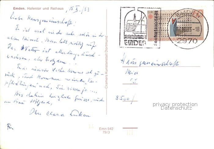 72570565 alte Postkarte Emden Ostfriesland Hafentor und Rathaus postalisch gelaufen Erhaltung siehe scans [AndreD76] KatCode: 11110003402000