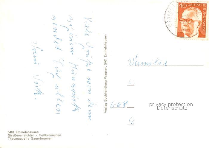 73866378 alte Postkarte Emmelshausen Strassenansichten Heilbruennchen Thaumaquelle Sauerbrunnen postalisch gelaufen Erhaltung siehe scans [FriedD77] KatCode: 11110007140036