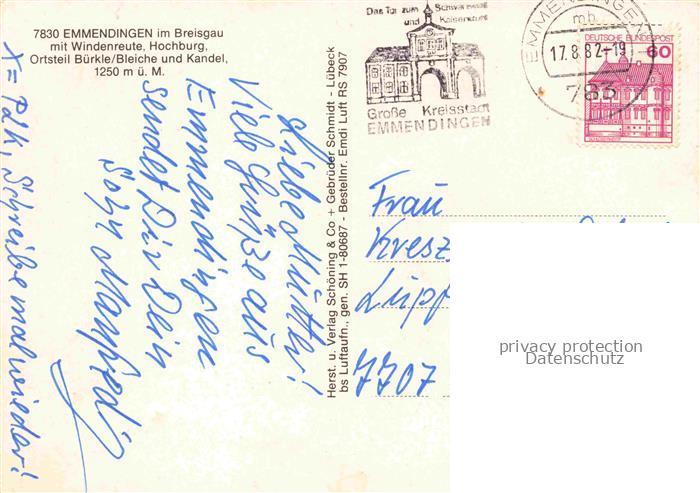74044182 alte Postkarte Emmendingen BW mit Windenreute Hochburg Buerkle Bleiche und Kandel Fliegeraufnahme postalisch gelaufen Erhaltung siehe scans [WerneD78] KatCode: 11110008316011