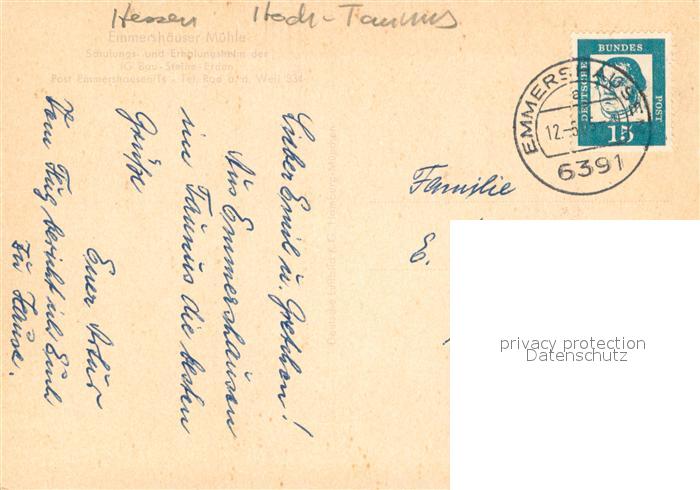 73646034 alte Postkarte Emmershausen Emmershaeuser Muehle Schulungs- und Erholungsheim im Taunus postalisch gelaufen Erhaltung siehe scans [FriedD77] KatCode: 11110006434013