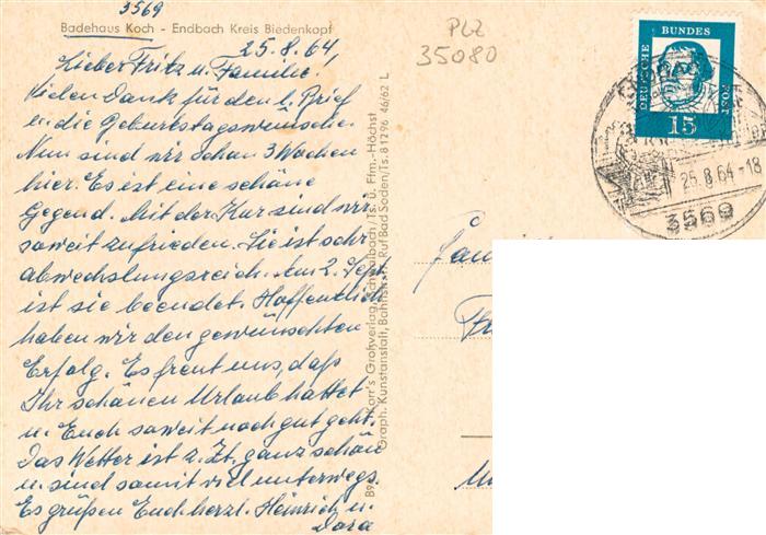73894028 alte Postkarte Endbach Bad Badehaus Koch Wassertretanlage Panorama postalisch gelaufen Erhaltung siehe scans [FriedD77] KatCode: 11110006534003