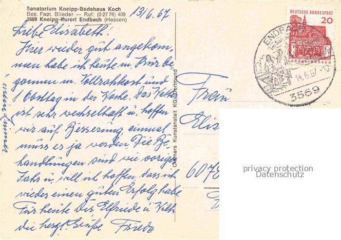 74136709 alte Postkarte Endbach Bad Endbach Hessen Sanatorium Kneipp Badehaus Koch postalisch gelaufen Erhaltung siehe scans [WerneD78] KatCode: 11110006534003