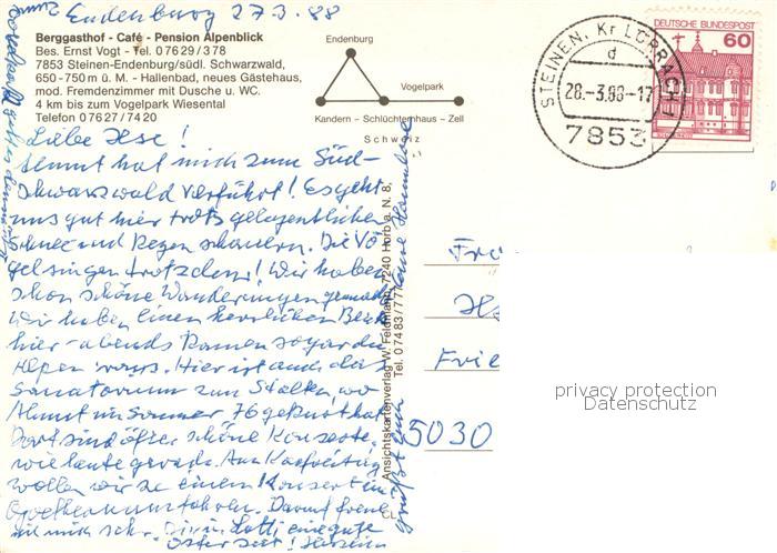 73765699 alte Postkarte Endenburg Berggasthof Cafe Pension Alpenblick Vogelpark Wiesental Gastraum postalisch gelaufen Erhaltung siehe scans [WerneD78] KatCode: 11110008336084