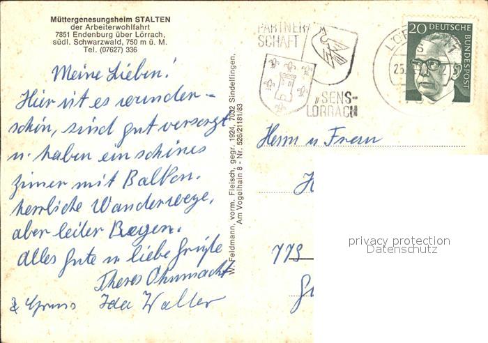 71938975 alte Postkarte Endenburg Muettergenesungsheim Stalten der Arbeiterwohlfahrt Schwarzwald postalisch gelaufen KatCode: 11110008336084
