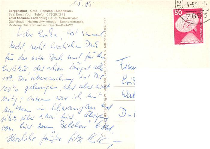 73878816 alte Postkarte Endenburg Steinen Berggasthof Gaestehaus Sonnenschein Hallenbad postalisch gelaufen Erhaltung siehe scans [WerneD78] KatCode: 11110008336084