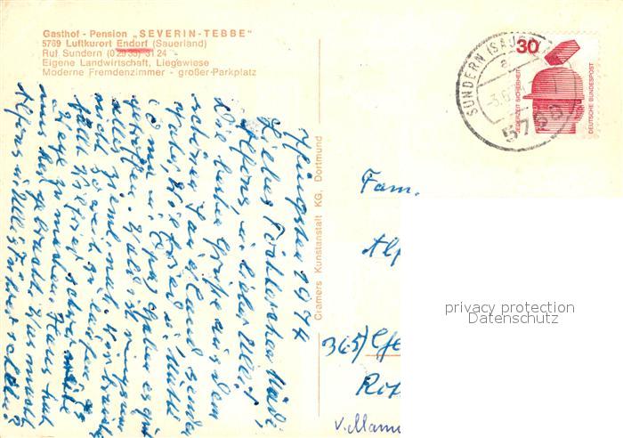 73159224 alte Postkarte Endorf Sauerland Gasthof Pension Severin Tebbe Gastraeume Panorama postalisch gelaufen Erhaltung siehe scans [WerneD78] KatCode: 11110005958044