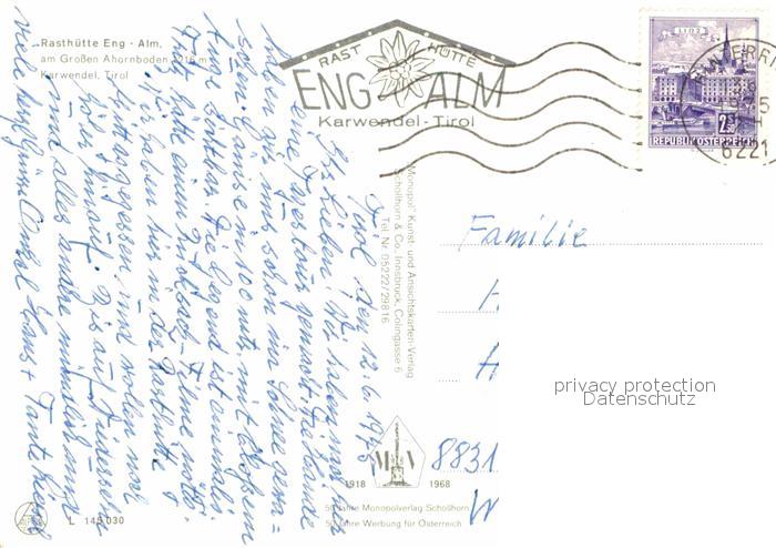72619480 alte Postkarte Eng Alm Rasthuette am Grossen Ahornboden Karwendelgebirge postalisch gelaufen Erhaltung siehe scans [FriedD77] KatCode: 11390335070936