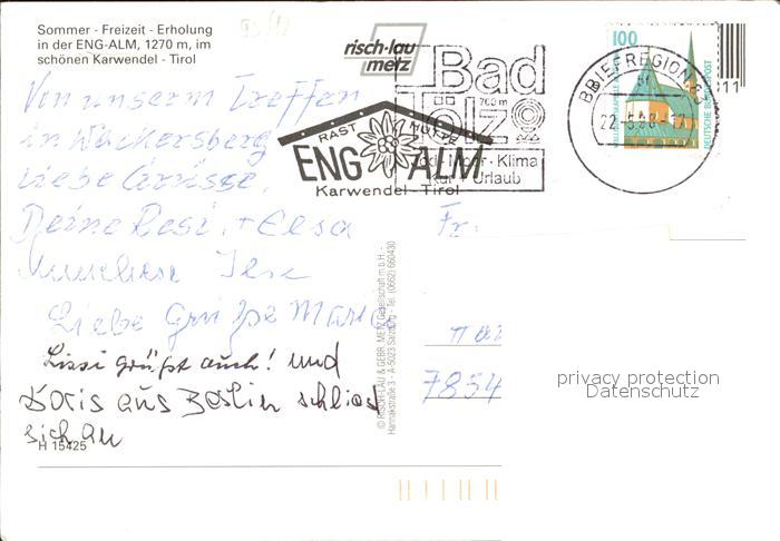 72485325 alte Postkarte Eng Karwendel Eng Alm Gaststube Terrasse Panorama postalisch gelaufen Erhaltung siehe scans KatCode: 11390335070926