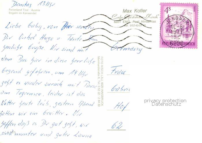 72862246 alte Postkarte Engalm Cafe Eng am Grossen Ahornboden postalisch gelaufen Erhaltung siehe scans [LiesaD40] KatCode: 11390335070926