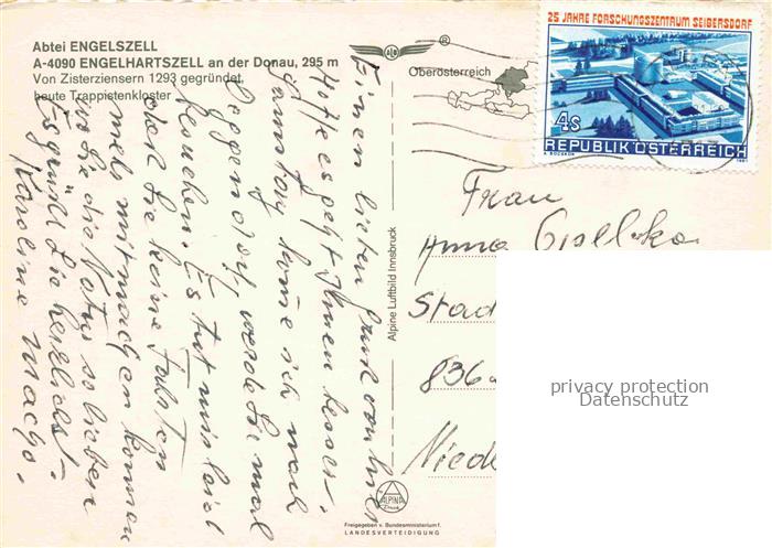 74026424 alte Postkarte Engelhartszell Donau Oberoesterreich AT Abtei Stift Engelszell an der Donau postalisch gelaufen Fliegeraufnahme Erhaltung siehe scans [FriedD77] KatCode: 11390311041407