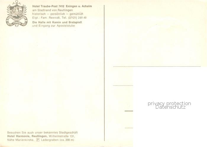 73776132 Eningen Achalm Hotel Traube Post Halle mit Kamin und Bratspiess postalisch nicht gelaufen Erhaltung siehe scans [WerneD78] KatCode: 11110008415019