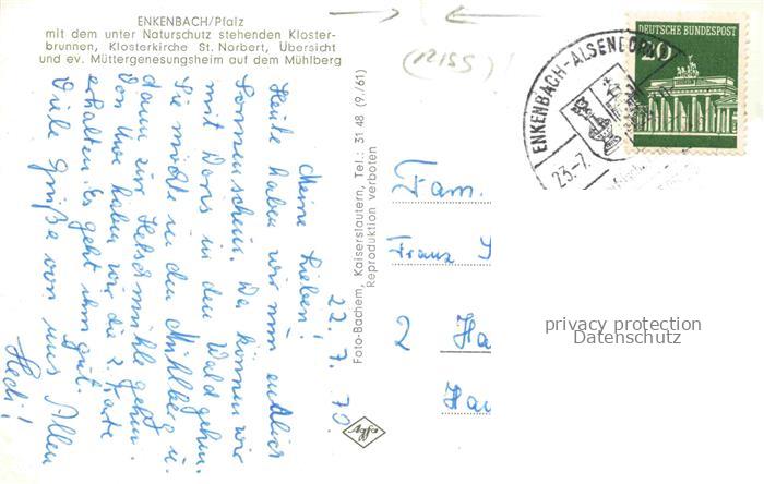 74154193 alte Postkarte Enkenbach-Alsenborn Kaiserslautern Rheinland-Pfalz Klosterbrunnen Klosterkirche St. Norbert Teilansicht Muettergenesungsheim auf dem Muehlberg postalisch gelaufen Erhaltung siehe scans [FriedD77] KatCode: 11110007335004