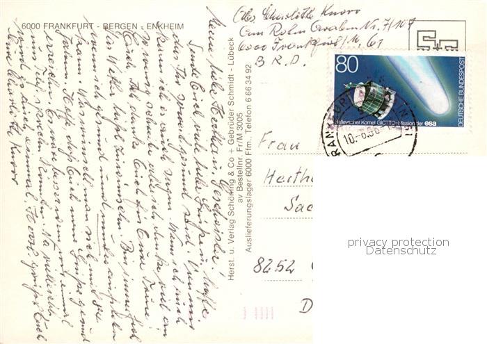73840942 Enkheim Bergen-Enkheim Rathaus Weisser Turm Schwimmbad Hessen-Center Guenthersbrunnen postalisch gelaufen Erhaltung siehe scans [FriedD77] alte Postkarte Frie Katcode 11110006412000