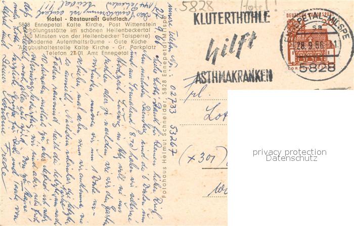 73704303 alte Postkarte Ennepetal Hotel Gundlach postalisch gelaufen Erhaltung siehe scans [LiesaD40] KatCode: 11110005954008