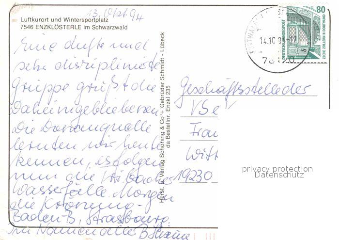 72621327 alte Postkarte Enzkloesterle postalisch gelaufen Erhaltung siehe scans [NatalD47] KatCode: 11110008235025