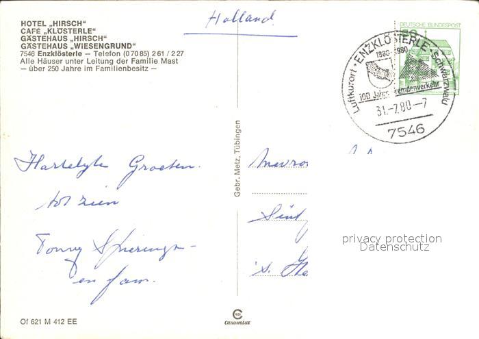 72255312 alte Postkarte Enzkloesterle Hote Hirsch Cafe Kloesterle Gaestehaus Hirsch und Wiesengrund postalisch gelaufen Erhaltung siehe scans KatCode: 11110008235025