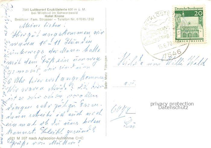 74110151 alte Postkarte Enzkloesterle Hotel Krone postalisch gelaufen Erhaltung siehe scans [IrynaD87] KatCode: 11110008235025