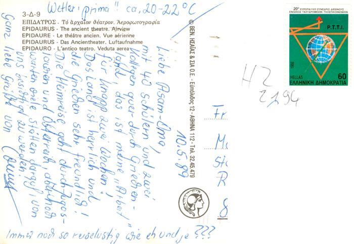 73907792 old postcard Epidaurus Epidauros Epidavros Peloppones Greece Amphitheater postalisch gelaufen Fliegeraufnahme Erhaltung siehe scans [FriedD77] KatCode: 11190