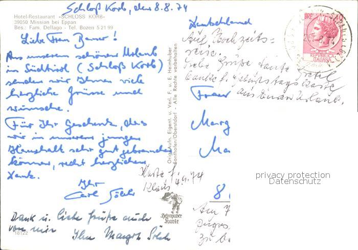 old postcard Eppan Suedtirol Hotel Restarant Schloss Korb postalisch gelaufen Erhaltung siehe scans