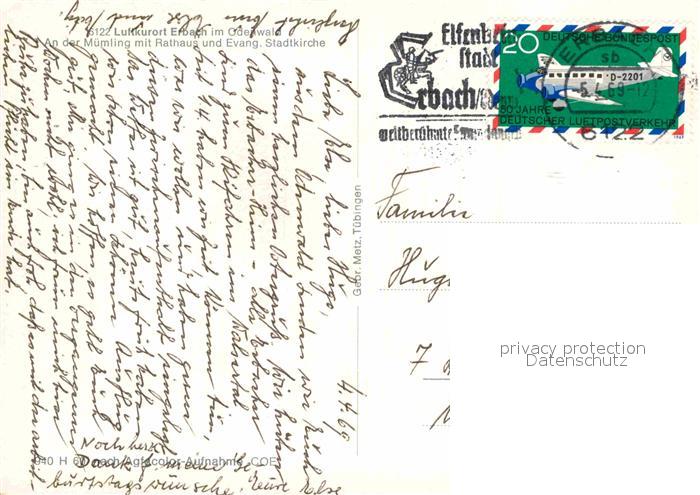 72759452 alte Postkarte Erbach Odenwald An der Muemling Rathaus Ev. Stadtkirche Luftkurort postalisch gelaufen Erhaltung siehe scans [FriedD77] KatCode: 11110006437006