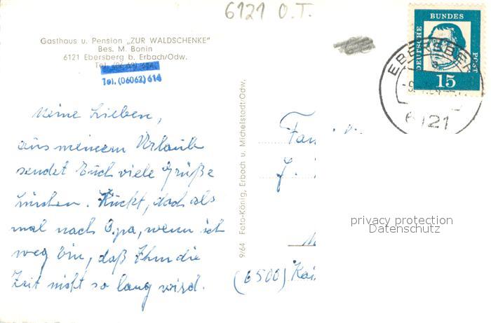 73706311 alte Postkarte Erbach Odenwald Gasthaus u. Pension Zur Waldschenke Aussenansicht postalisch gelaufen Erhaltung siehe scans [LiesaD40] KatCode: 11110006437006