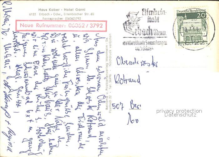 72446892 alte Postkarte Erbach Odenwald Haus Kober Hotel Garni postalisch gelaufen Erhaltung siehe scans KatCode: 11110006437006