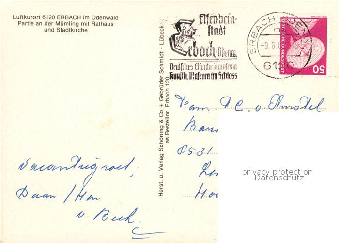 72935738 alte Postkarte Erbach Odenwald Partie an der Muemling Rathaus Stadtkirche postalisch gelaufen Erhaltung siehe scans [FriedD77] KatCode: 11110006437006