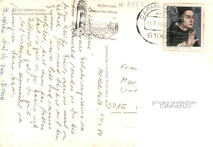 73115216 alte Postkarte Erbach Odenwald Rathaus Stadtkirche postalisch gelaufen Erhaltung siehe scans [NatalD47] KatCode: 11110006437006