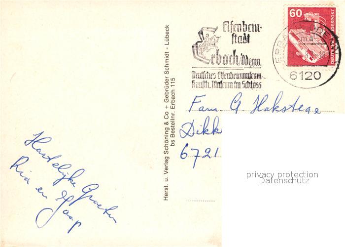 72930996 alte Postkarte Erbach Odenwald Teilansicht Schloss Marktplatz Hirschgalerie Im Staedtel Schlosshof Treppenweg Festhalle Rittersaal postalisch gelaufen Erhaltung siehe scans [WerneD78] KatCode: 11110006437006