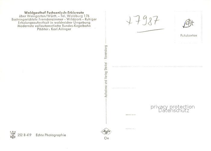 43156629 Erbisreute Waldgasthof Fuchsenloch Kegelbahn postalisch nicht gelaufen Erhaltung siehe scans [KathaD81] KatCode: 11110008436069