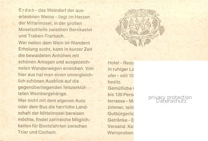 73531791 Erden Hotel Restaurant Zum Moseltal Terrasse Weindorf postalisch nicht gelaufen Werbekarte (keine Postkarte) Erhaltung siehe scans [FriedD77] KatCode: 11110007231030