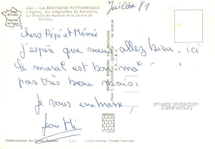 13786664 Erdeven 56 Morbihan Eglise les megalythes de Kerzhero Le Moulin de Narbon et la Greve de Kerilio postalisch gelaufen Erhaltung siehe scans [WerneD78] carte postale Wern Katcode 11170056156054