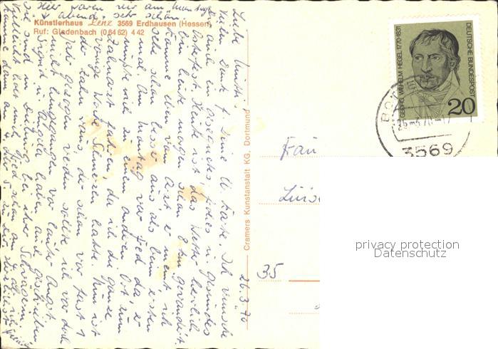 72105430 alte Postkarte Erdhausen Gladenbach Kuenstlerhaus Lenz postalisch gelaufen Erhaltung siehe scans KatCode: 11110006534010