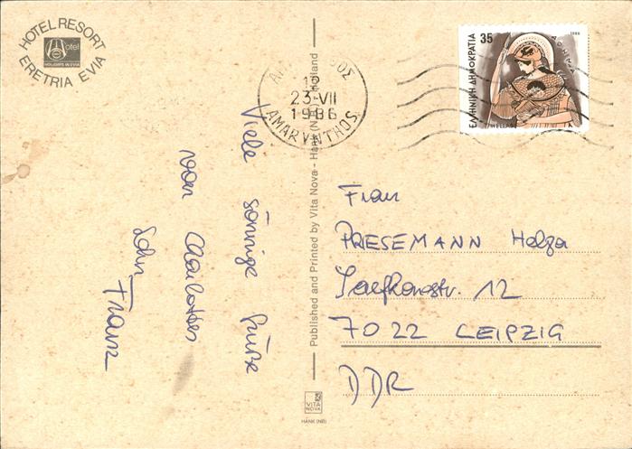 old postcard Eretria Evia Hotel Resort Evia Swimming Pool Restaurant Sonnenuntergang Abendstimmung Fliegeraufnahme postalisch gelaufen Erhaltung siehe scans