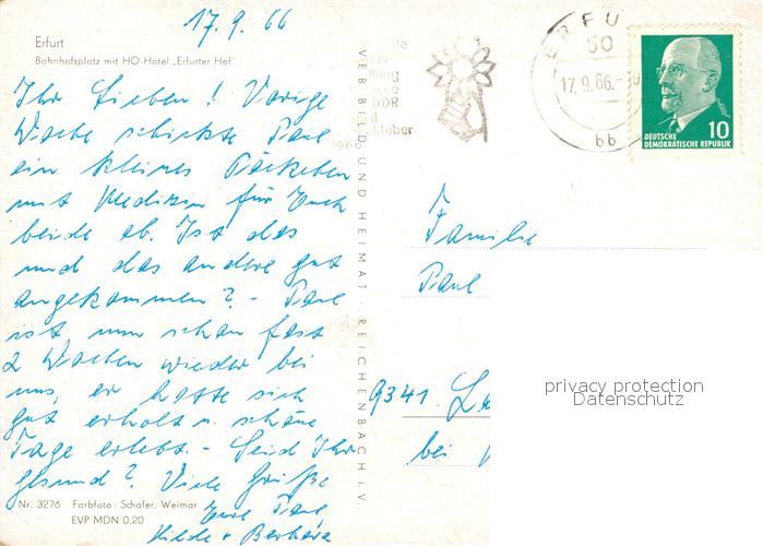 73073085 alte Postkarte Erfurt Bahnhofplatz Hotel Erfurter Hof postalisch gelaufen Erhaltung siehe scans [KathaD81] KatCode: 11110016051000