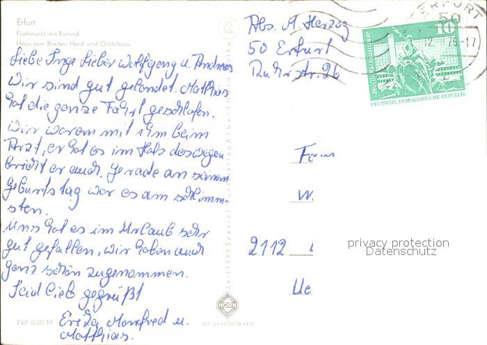 72289408 alte Postkarte ERFURT CITY Fischmarkt Roland Haus zum Breiten Gildehaus postalisch gelaufen Erhaltung siehe scans KatCode: 11110016051000