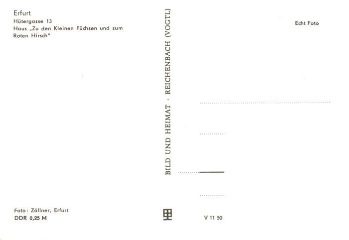 73885000 ERFURT CITY Haus „Zu den Kleinen Fuechsen und zum Roten Hirsch“ Huetergasse 13 postalisch nicht gelaufen Erhaltung siehe scans [NoemiOhl] Noem Katcode 11110016051000