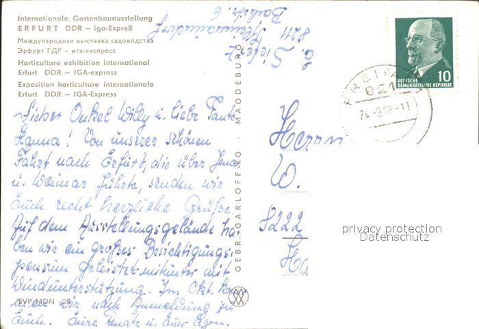 71939401 alte Postkarte ERFURT CITY Iga Express Internationale Gartenbauausstellung postalisch gelaufen Erhaltung siehe scans KatCode: 11110016051000